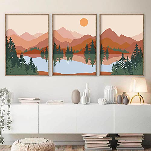Mid Century Wall Art Boho Abstract Mountain Lake Bomen Poster Print Nordic Foto Natuur Landschap Canvas Schilderij Woonkamer 50x70cmx3 Unframed