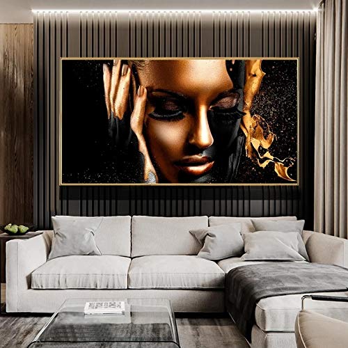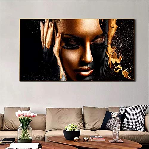 Moderne Kunst Zwart Goud Vrouw Canvas Schilderijen Afrikaanse Wall Art Posters en Prints Scandinavische Foto’s voor Woonkamer 70x140cm (28x55in) Frameless
